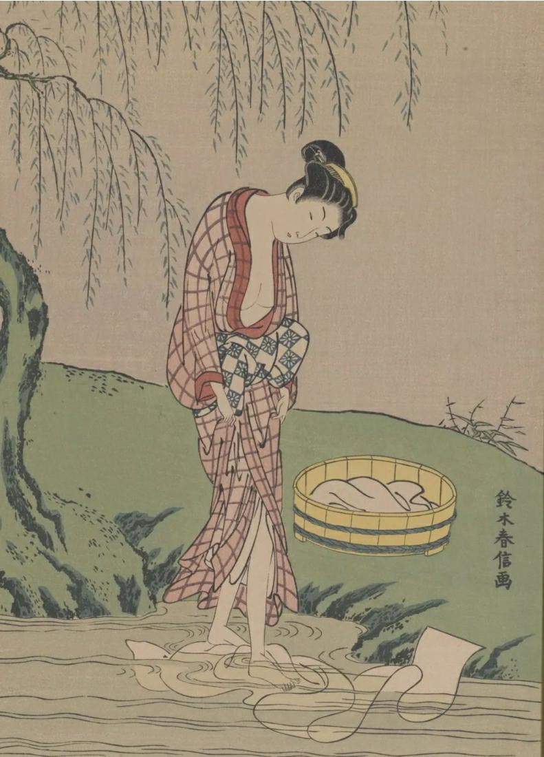 在构图上,春信着意的是河边的春柳轻拂,石上的绿草如茵,从而托出洗衣女垂首而立的优美。整个画面笼罩着被落日余晖烧透的梦幻色,想必是夕阳西下的时辰。平民女外出洗衣,足踏衣物,水流清冽。盛衣用的木盆放置身边。春信只是截取了日常劳作的一个画面,却勾勒出了最不讲娇滴、最不会做作的平民女形象以及极具生活趣味的镜像。