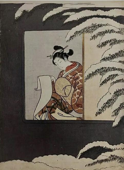 孙康是晋人。春信能熟知他,表明他的文化修养是高的。而他能以此为题材“见立”(用典)成一幅美女雪中夜读图,则是他的灵性使然。夜雪做成冬,恰上心头。画面描绘了隆冬深夜,皑皑白雪压弯松枝,旷野莽茫茫。一位女子不畏风寒雪冷,拉开纸窗,借着雪光反射,忘我地读着长折。“夜深知雪重,时闻折竹声”,她在读白居易?“梦里相逢人不见,若知是梦何须醒”,她在读小野小町?绘师春信给这位女人梳了“兵库 髷 ”,腰带前系。从样态看应该是一位游女,但不影响她学孙康。