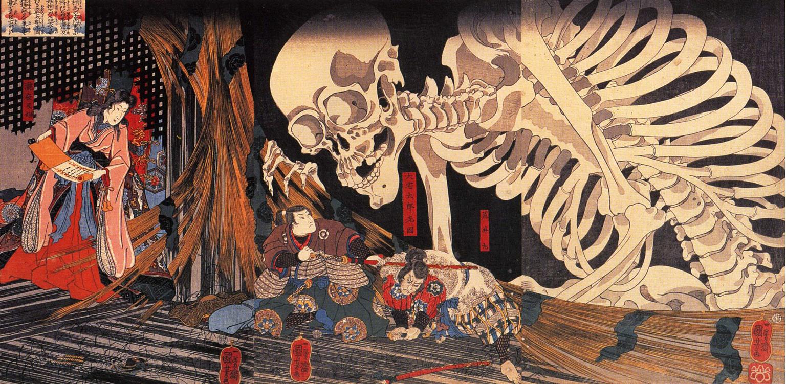 他就是1798年出生的歌川国芳。他的《相马古内里》(1845年,千叶市美术馆藏)名画,是最具恐惧的历史哲学在画作上的再现。占据画面的是一个巨大骷髅,比人高出15倍。骷髅的来源,一说是来自战场上无人收领的士兵尸体,一说是来自被饿死的尸骨。取名为“咔嚓骷髅”。这幅画表现日本历史上平将门的妹妹泷夜叉姬,为了替兄报仇,借用巨大恐怖的骷髅与大宅太郎光圀和荒井丸对决的物语。黑暗中展现的人体解剖学,非常的逼真与震撼。