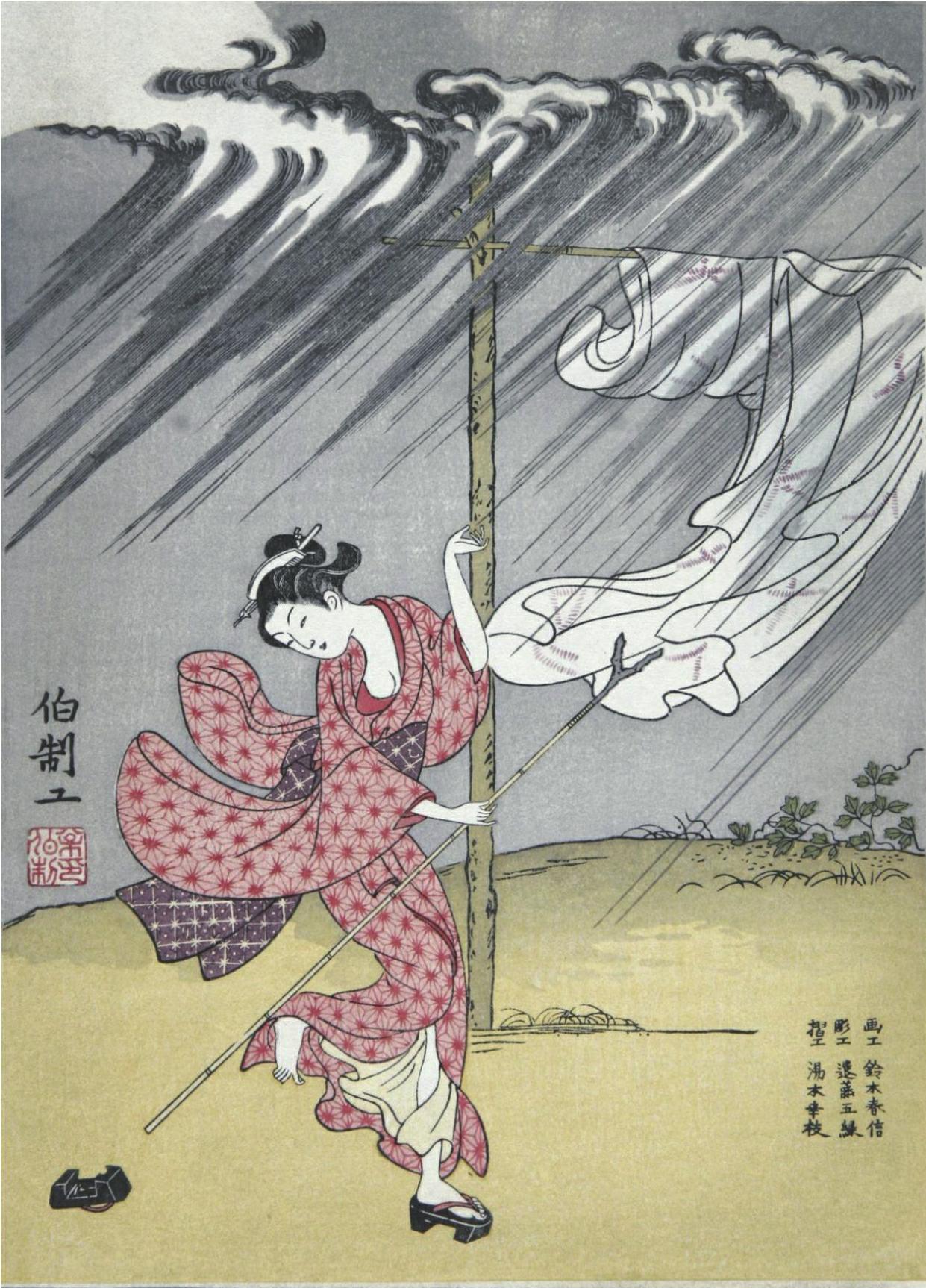画面上,这位青春女子应该是恋着的爱着的。振袖与腰带的细绘暗示人们,她的眼神告诉人们,她有惆怅,有闻得昔人的心思,虽然不至夜夜垂泪至天明,但在屋中却也湿透了袖子呢。想起平安时代的和泉式部与敦道亲王之间,“夜深沉兮情盈盈,通宵不眠思底事”的那些事那些情。