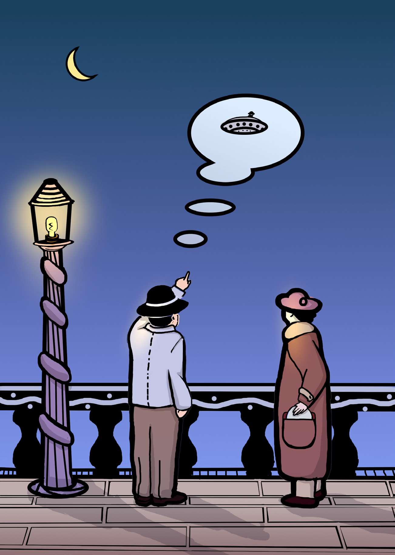 “我告诉你,你也不会相信。就在刚才,在那里,我看见一个奇怪的男子。那个家伙从口袋里拿出一个圆盘。你听懂了吗?就是飞碟呀。我眼看着那个圆盘变得越来越大,然后,他就坐进去飞往夜空了。”(选自《时尚》)