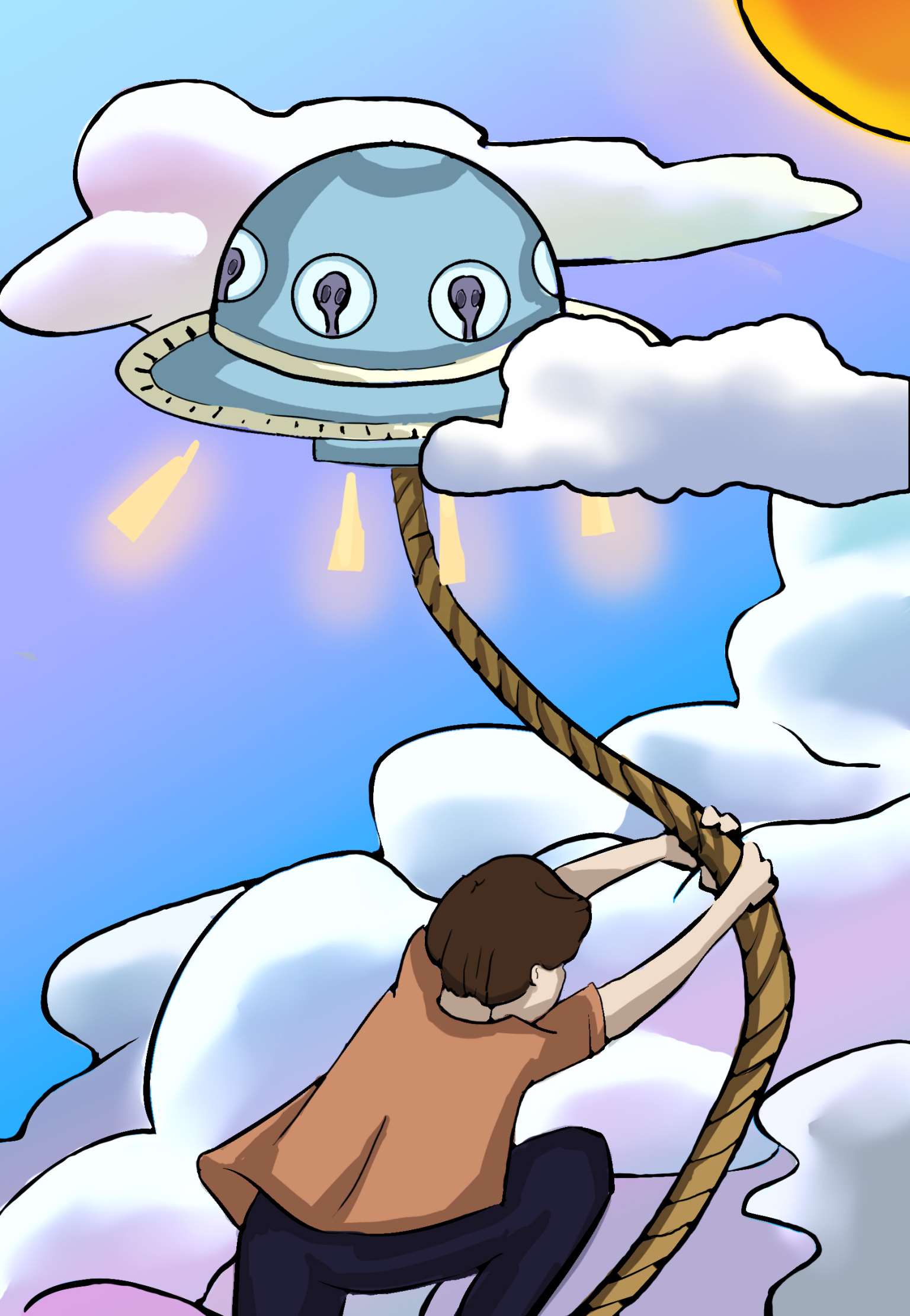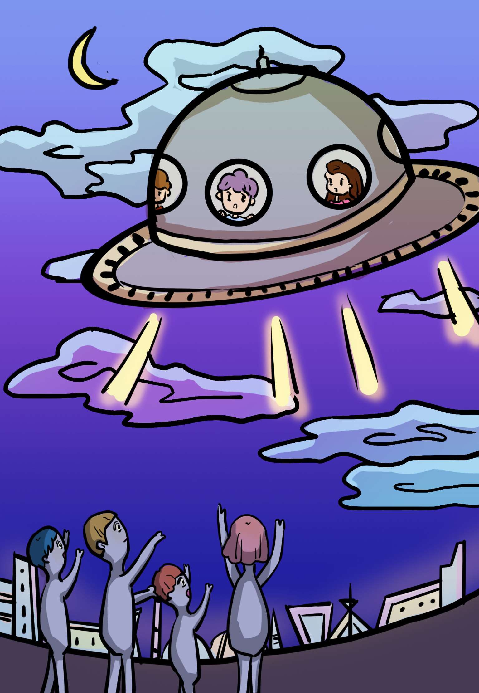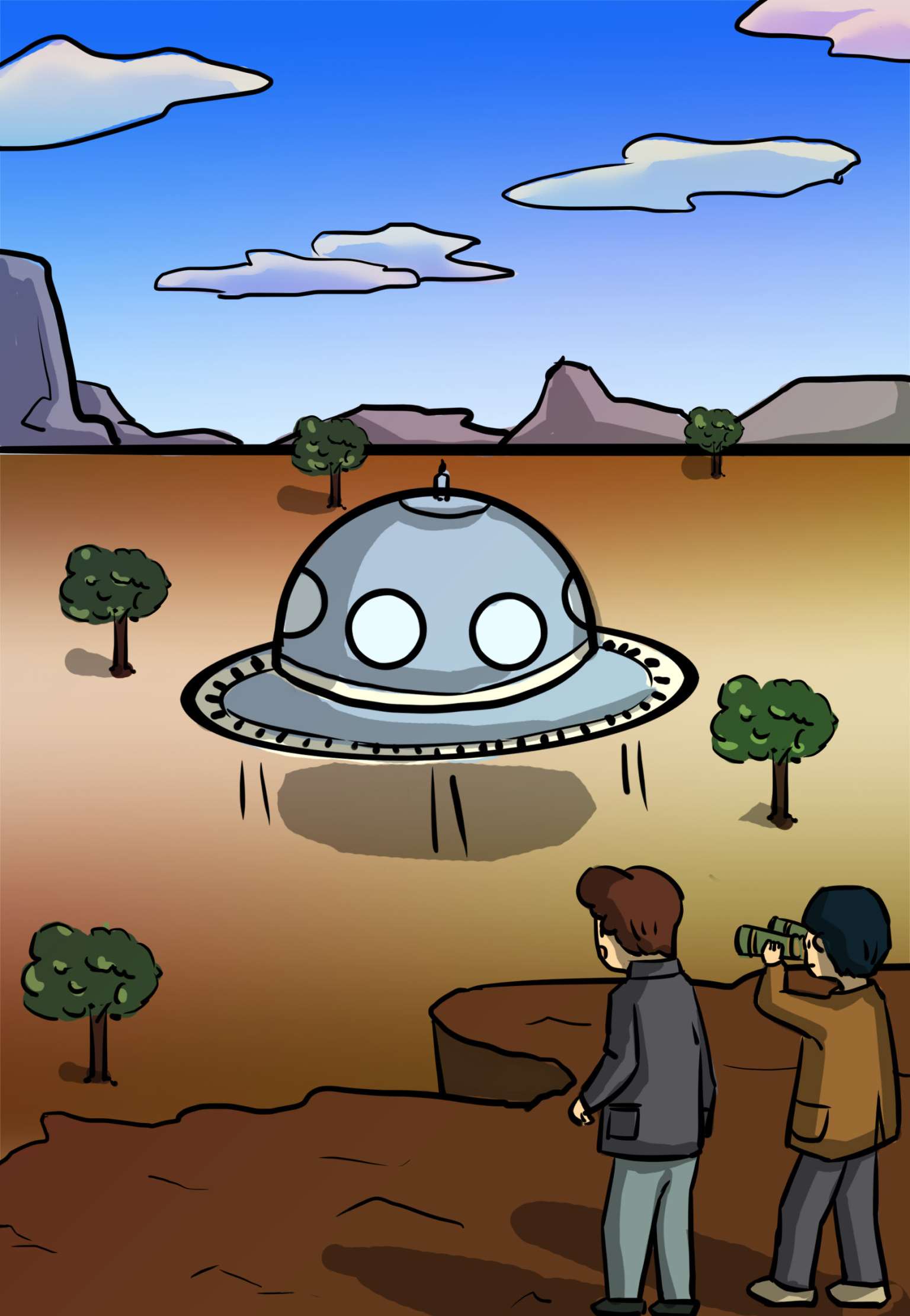“你在嚷嚷什么?”另一个青年抬头一看,一个巨大的圆盘状飞行物出现在云端,然后慢慢地下降,“这就是人们说的UFO(不明飞行物)吗?这不是人类能造出来的。”(选自《仪式》)