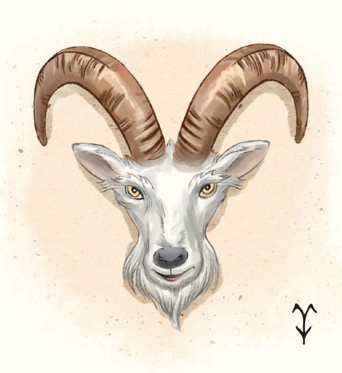 羊 嘴巴尖尖,两角弯曲,性情温顺。