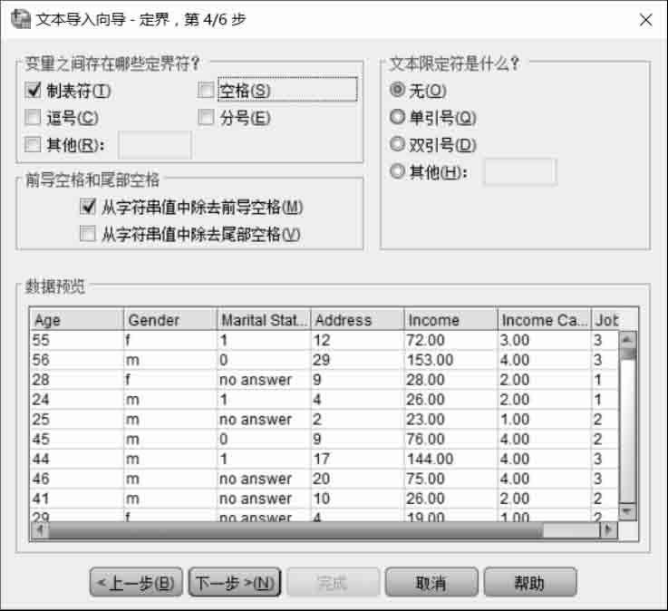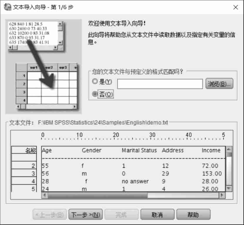 对话框下方是按预定义格式读入数据文件的预览,可见本例中SPSS的预定义格式并没有正确地对文件进行识别,所以我们选中“否”单选按钮,然后单击“下一步”按钮,弹出如图1.4所示的对话框。