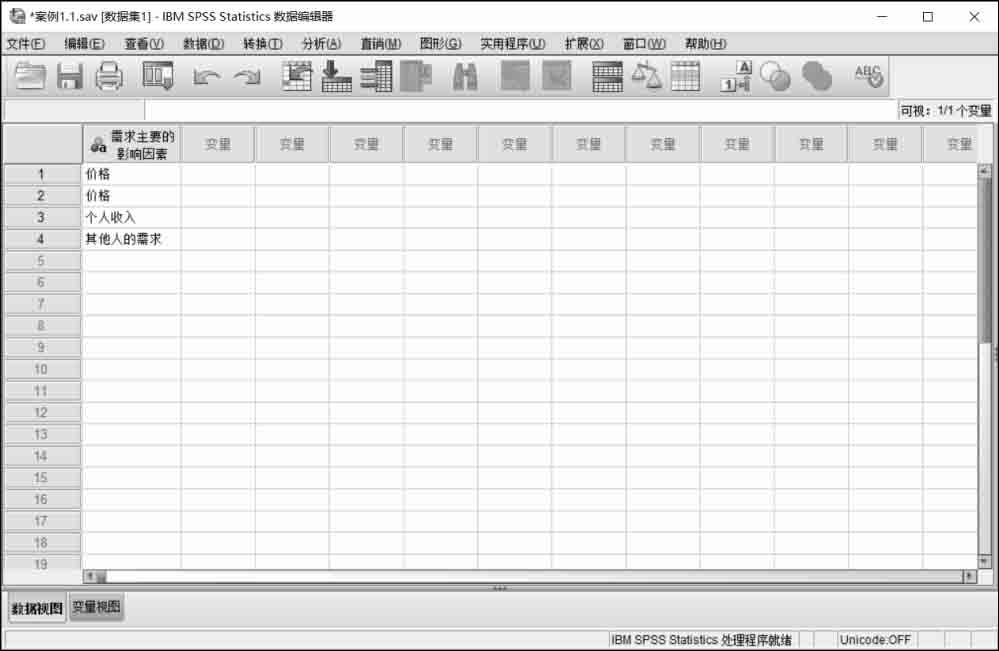【解答过程】 首先在“变量视图”窗口中定义“需求主要的影响因素”为字符型变量,并且将其“宽度”从默认值调整到“20”,然后切换到“数据视图”窗口输入相应的信息即可。最终结果如图1.11所示。
