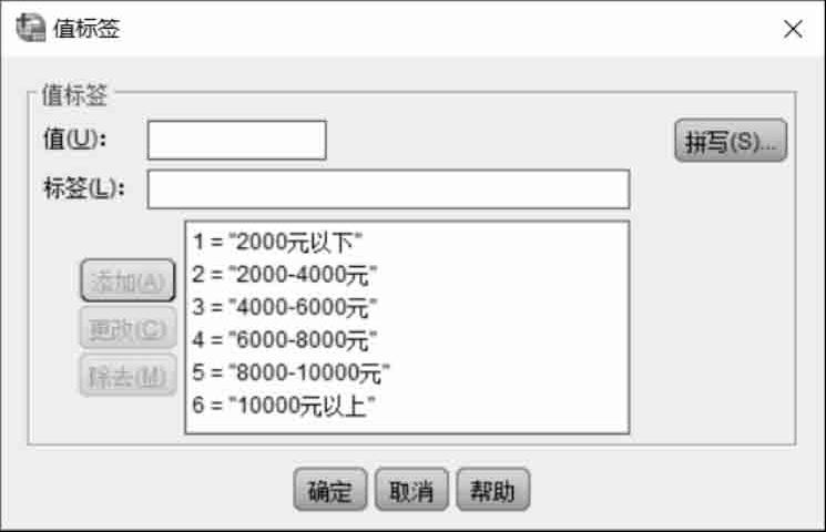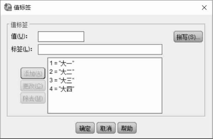 【解答过程】 首先定义“年级”和“价格范围”两个变量,然后定义值标签。值标签的定义过程是:首先在“变量视图”窗口中找到拟定义的变量,然后单击“值”那一栏,单击右侧的“值标签”按钮,弹出“值标签”对话框,在“值”文本框中输入预定义的数值,在“标签”文本框中输入问题的特定选项,单击“添加”按钮,即可实现“选项”与“值”之间的绑定。例如:在“变量视图”窗口中找到“年级”变量,然后单击“值”那一栏,单击右侧的“值标签”按钮,弹出“值标签”对话框,在“值”文本框中输入“1”,在“标签”文本框中输入“大一”,单击“添加”按钮,即实现“大一”与“1”之间的绑定。其他可参照上述操作进行处理,得到的最终结果如图1.12和图1.13所示。