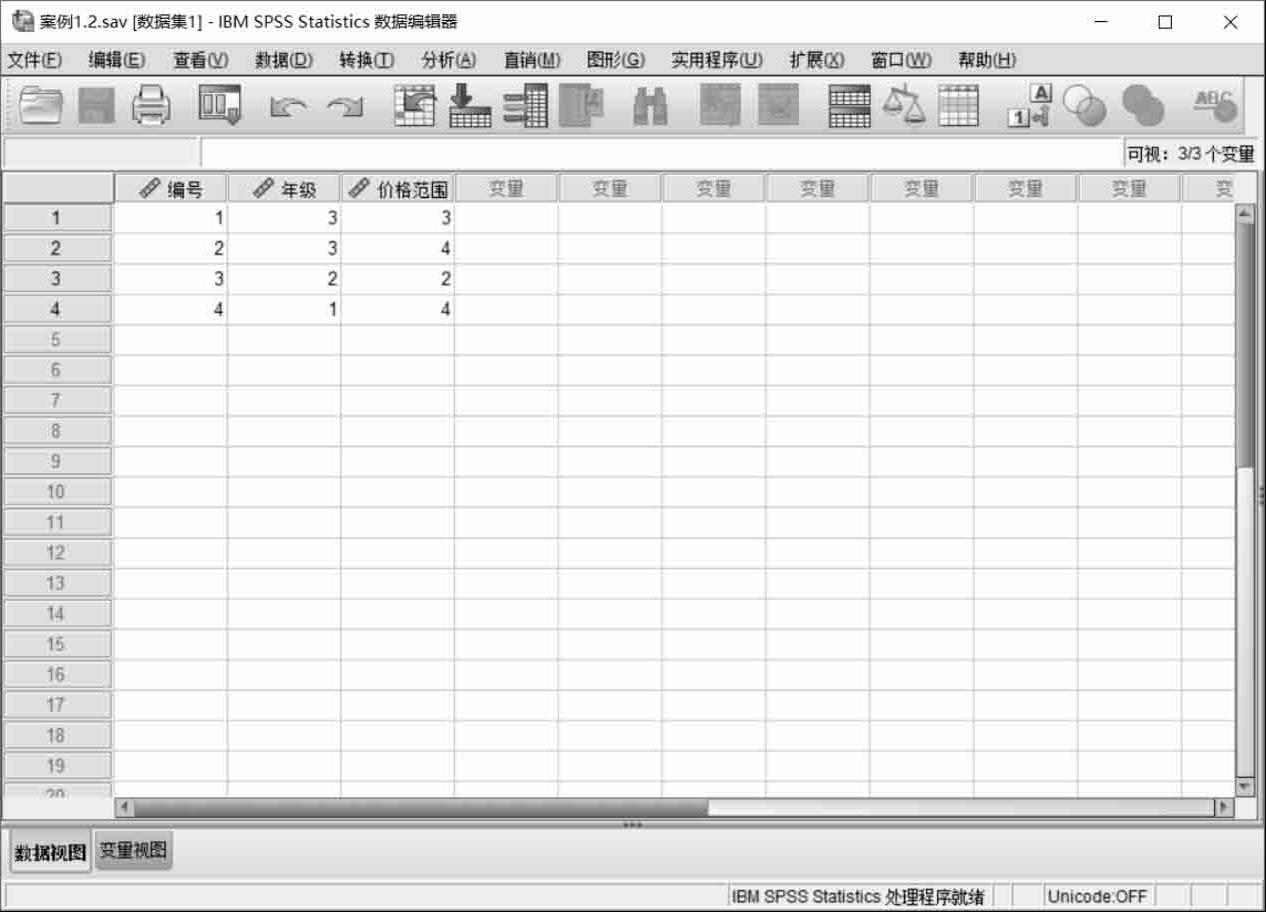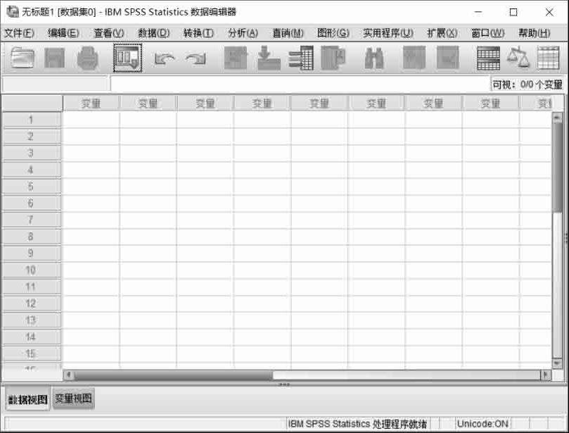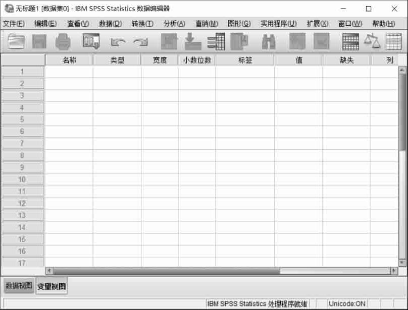SPSS的数据录入涉及“数据视图”和“变量视图”两个界面,如图1.9和图1.10所示。
