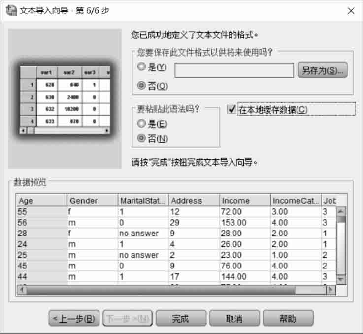 在此对话框中,可以对是否保存此文件格式以备以后使用以及是否粘贴该语法进行选择。这里我们采用默认设置,单击“完成”按钮,可以看到数据已经被成功地读入到了SPSS中。