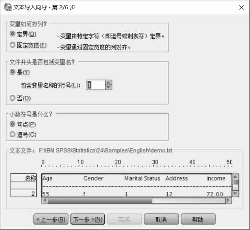 对话框中有两个问题:第一个问题是“变量如何排列?”,并且有两个选择,一个是“定界”,另一个是“固定宽度”,一般情况下选择“定界”;第二个问题是“文件开头是否包括变量名?”,选中“是”单选按钮,然后单击“下一步”按钮,弹出如图1.5所示的对话框。