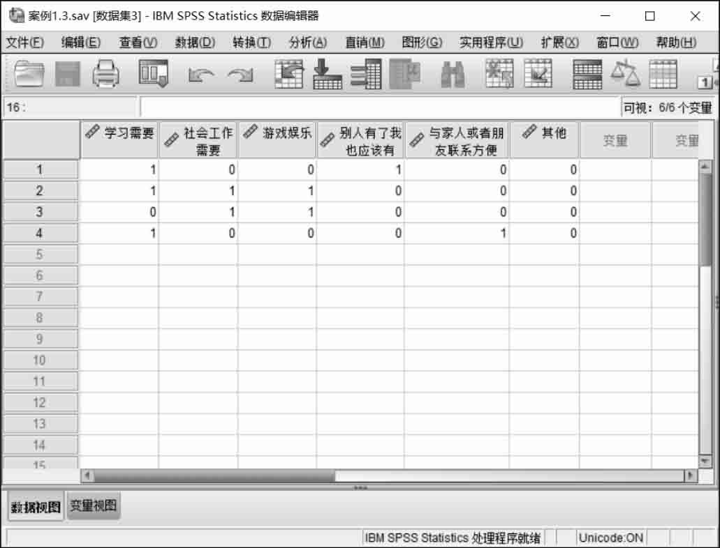 【解答过程】 首先定义6个变量“学习需要”“社会工作需要”“游戏娱乐”“别人有了我也应该有”“与家人或者朋友联系方便”“其他”为合适的变量形式,然后定义值标签,操作与单选题相同,这里不再赘述,结果如图1.15所示。