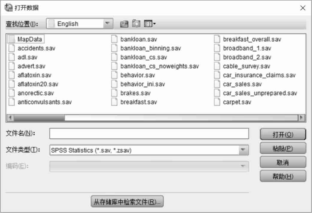 SPSS可以直接读入许多其他格式的数据文件,其操作与打开SPSS类型的数据文件相同,选择“文件”|“打开”|“数据”命令,弹出如图1.1所示的对话框。