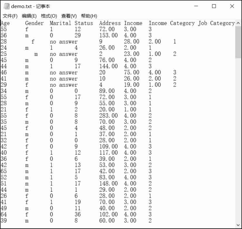对于文本格式的数据文件,除了上面介绍的方式外,还有一种是通过“文件”|“打开文本数据”命令打开的。这两种方式是等价的,之所以存在第二种打开方式,一方面是因为读入纯文本的情况非常普遍,另一方面是为了与SPSS的旧版本保持兼容。因为打开文本格式的数据文件需要后续的一些操作,而且使用非常普遍,所以我们有必要详细介绍一下。下面将以SPSS系统自带的demo.txt数据文件(如图1.2所示)为例进行说明。