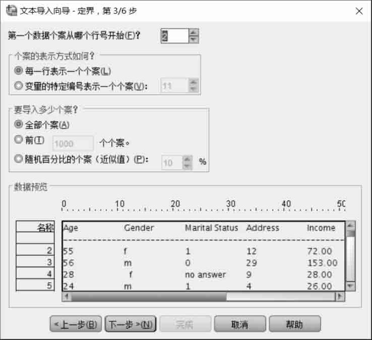 对话框中有三个问题:第一个问题是“第一个数据个案从哪个行号开始?”,右侧可以输入行数,因为本例中数据的第一行是变量名,所以这里输入2;第二个问题是“个案的表示方式如何?”,一般情况下选中“每一行表示一个个案”单选按钮;第三个问题是“要导入多少个案?”,此处选中“全部个案”单选按钮,然后单击“下一步”按钮,弹出如图1.6所示的对话框。