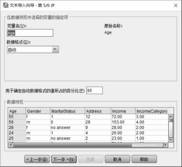在此对话框中,用户可以在“数据预览”列表框中选择列变量,并对其变量名和类型进行修改。本例不做修改,单击“下一步”按钮,弹出如图1.8所示的对话框。