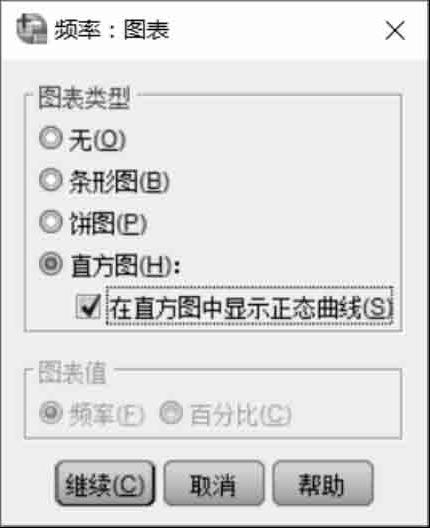 设置图表的输出。单击“频率”对话框中的“图表”按钮,弹出如图2.4所示的对话框,选择有关的图形输出。在此我们选择直方图,并且带正态曲线。