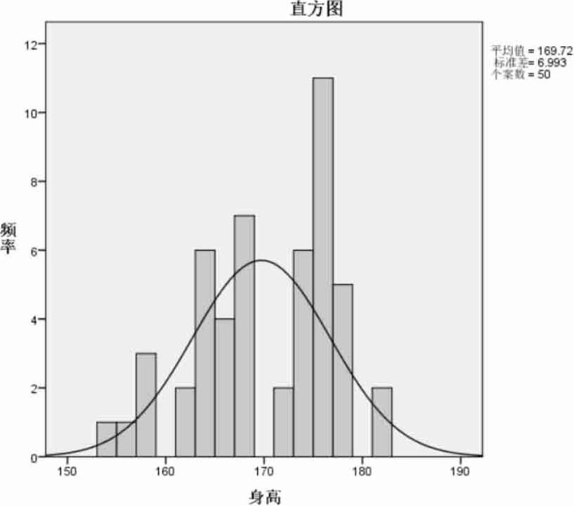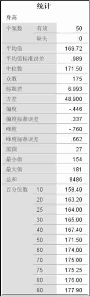 从表2.2中可以读出以下信息:有效样本数为50个,没有缺失值。学生的平均身高为169.72,标准差为6.993,最大值为181,最小值为154。