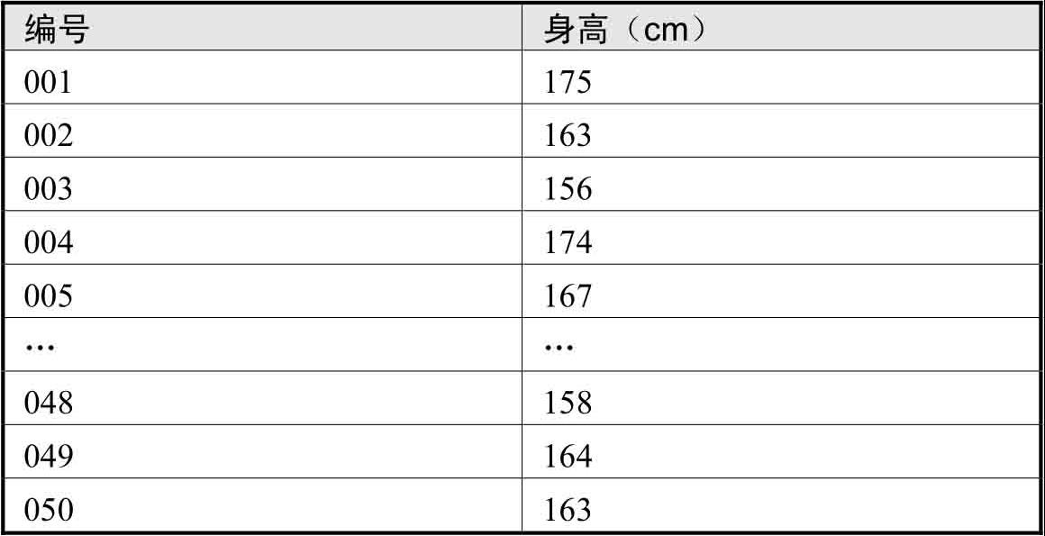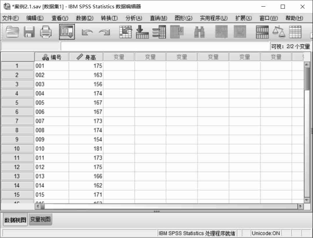 在用SPSS进行分析之前,我们要把数据录入到SPSS中。本例中有两个变量,分别是编号和身高。我们把编号定义为字符型变量,把身高定义为数值型变量,然后录入相关数据。录入完成后,数据如图2.1所示。