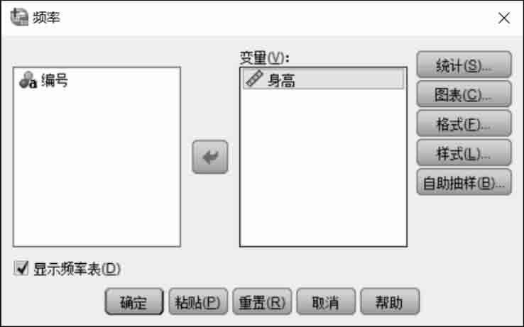 选择进行频数分析的变量。在“频率”对话框的左侧列表框中选择“身高”选项,单击中间的