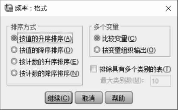 设置相关输出的格式。单击“频率”对话框中的“格式”按钮,弹出如图2.5所示的对话框。“排序方式”选项组用于设置频数表中各个数据值的排列顺序,其中“按值的升序排序”表示按数据值的大小升序排列;“按计数的升序排序”表示按数据值的频数升序排列。本例我们选中“按值的升序排序”单选按钮。“多个变量”选项组是针对按多个变量进行频数输出的情形,因为本例中我们进行频数输出依据的变量只有“身高”,所以这里选择默认设置。