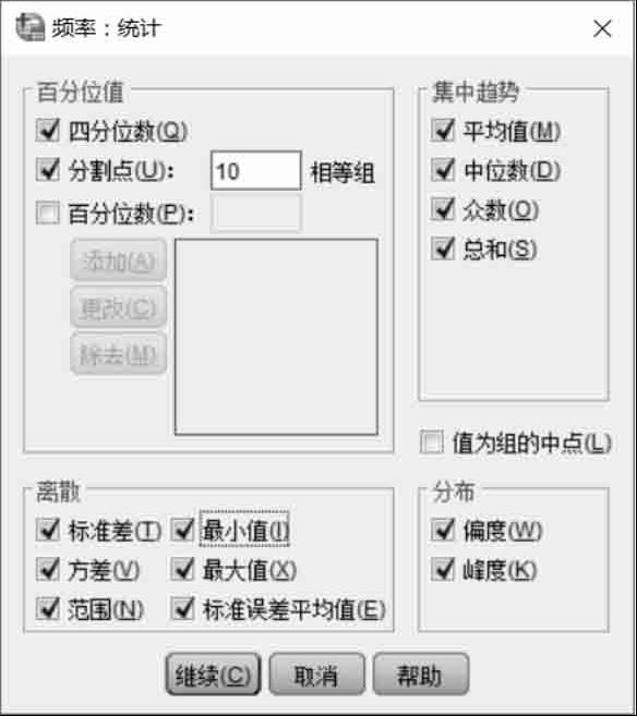 选择输出相关描述统计量。单击“频率”对话框右上角的“统计”按钮,弹出如图2.3所示的对话框,在该对话框中可以设置相关描述统计量。我们在“百分位值”选项组中选中“四分位数”“分割点”复选框;在“集中趋势”选项组中选中“平均值”“中位数”“众数”“总和”复选框;在“离散”选项组中选中“标准差”“方差”“范围”“最小值”“最大值”“标准误差平均值”复选框;在“分布”选项组中选中“偏度”“峰度”复选框。设置完毕后,单击“继续”按钮返回“频率”对话框。