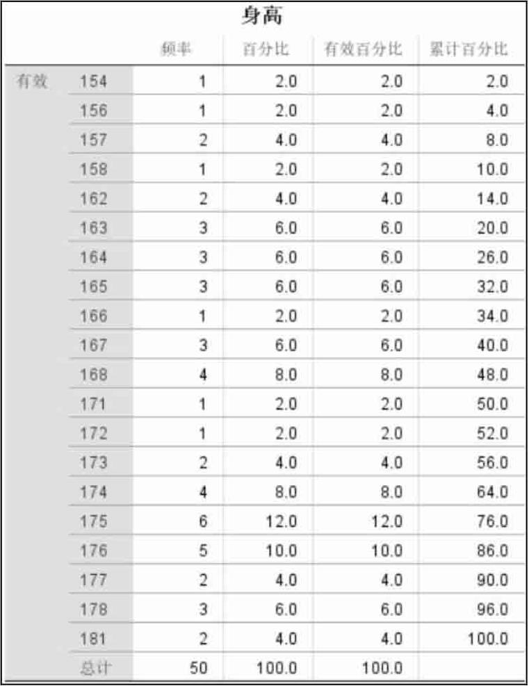 表2.3给出了学生身高的频数分布。该表从左到右分别是有效的样本值、频率、频率占总数的百分比、有效数占总数的百分比、累计百分比。