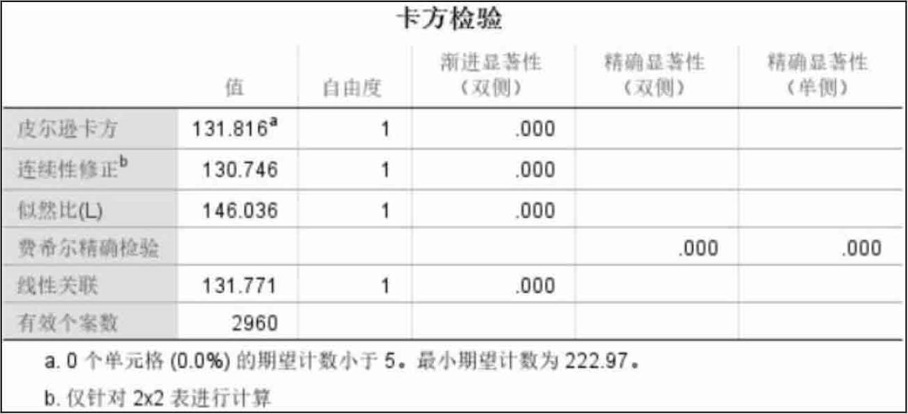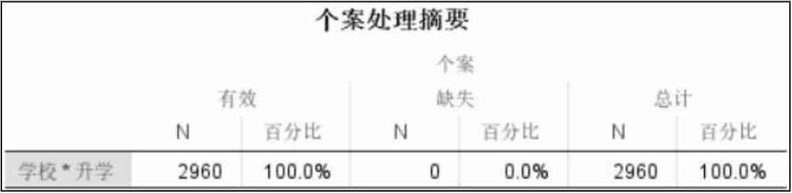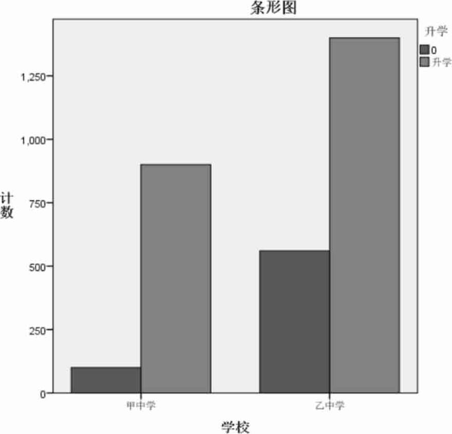 如表2.16所示,卡方检验的结果是非常显著的,说明两个学校的升学率之间有着明显的差别。