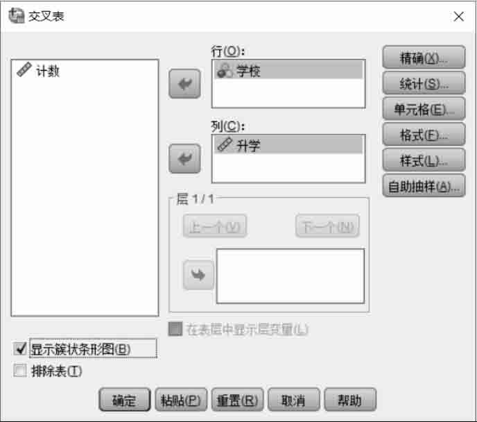 按钮,使之进入右侧的“列”列表框。因为没有别的变量参与列联表分析,所以这里没有层控制变量。最后选中“显示簇状条形图”复选框。