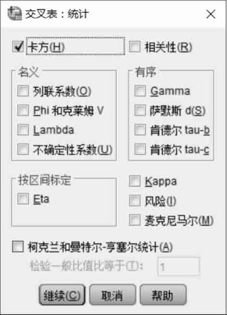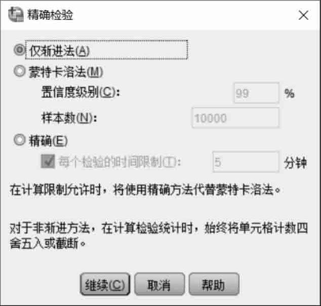 选择检验统计量的计算方法。单击“交叉表”对话框右上角的“精确”按钮,弹出如图2.24所示的对话框,选中“仅渐进法”单选按钮,单击“继续”按钮,返回“交叉表”对话框。