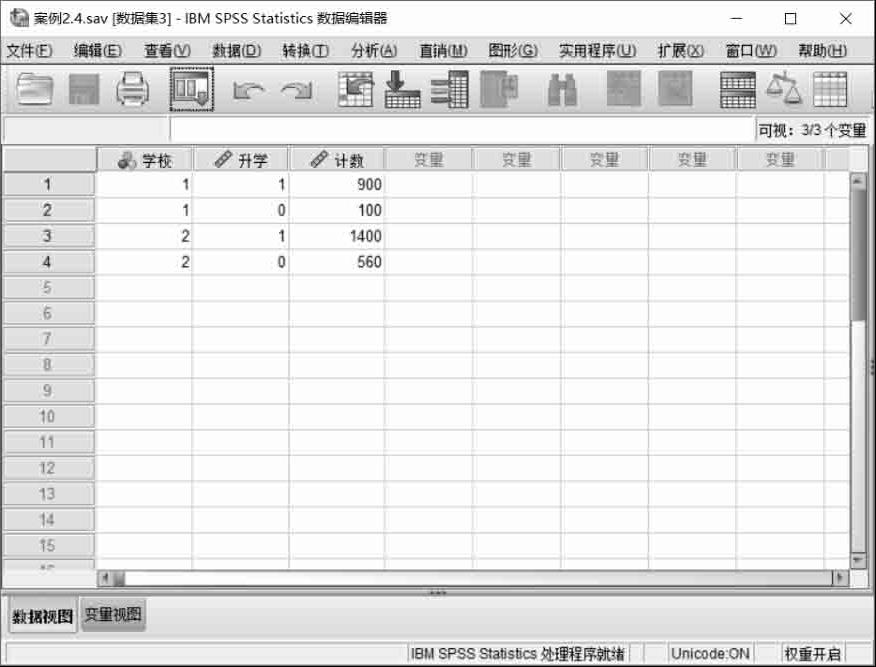 在用SPSS进行分析之前,我们要把数据录入到SPSS中。本例中3个变量分别是学校、升学和计数。我们把学校定义为字符型变量,把升学和计数定义为数值型变量,对学校和升学两个变量进行相应的值标签操作,对学校变量用“1”表示“甲中学”,“2”表示“乙中学”,对升学变量用“1”表示“升学”,“0”表示“未升学”,然后录入相关数据。录入完成后,数据如图2.21所示。