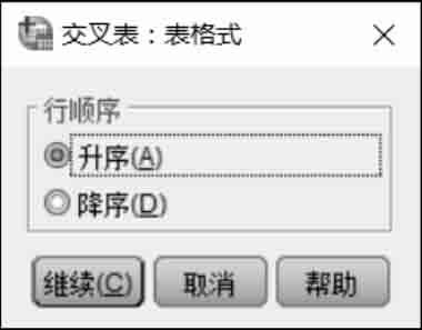 最后选择行变量是升序排列还是降序排列。单击“交叉表”对话框右侧的“格式”按钮,弹出如图2.27所示的对话框,在该对话框中可以设置行变量的排序方式。这里选中“升序”单选按钮。