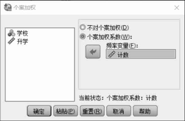 进入SPSS 24.0,对数据进行预处理,以计数变量对升学变量进行加权。选择“数据”|“个案加权”命令,弹出如图2.22所示的对话框。在“个案加权”对话框中选中“个案加权系数”单选按钮,然后在左侧的列表框中选中“计数”,单击