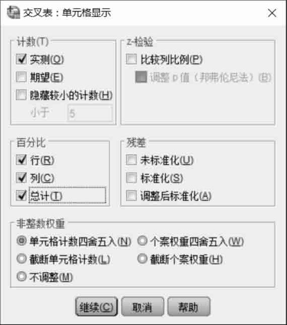 选择列联表单元格中需要计算的指标。单击“交叉表”对话框右侧的“单元格”按钮,弹出如图2.26所示的对话框,在该对话框中可以设置相关输出内容。在“计数”选项组中选中“实测”复选框;在“百分比”选项组中选择“行”“列”“总计”复选框;在“非整数权重”选项组中选中“单元格计数四舍五入”复选框。设置完毕后,单击“继续”按钮返回“交叉表”对话框。