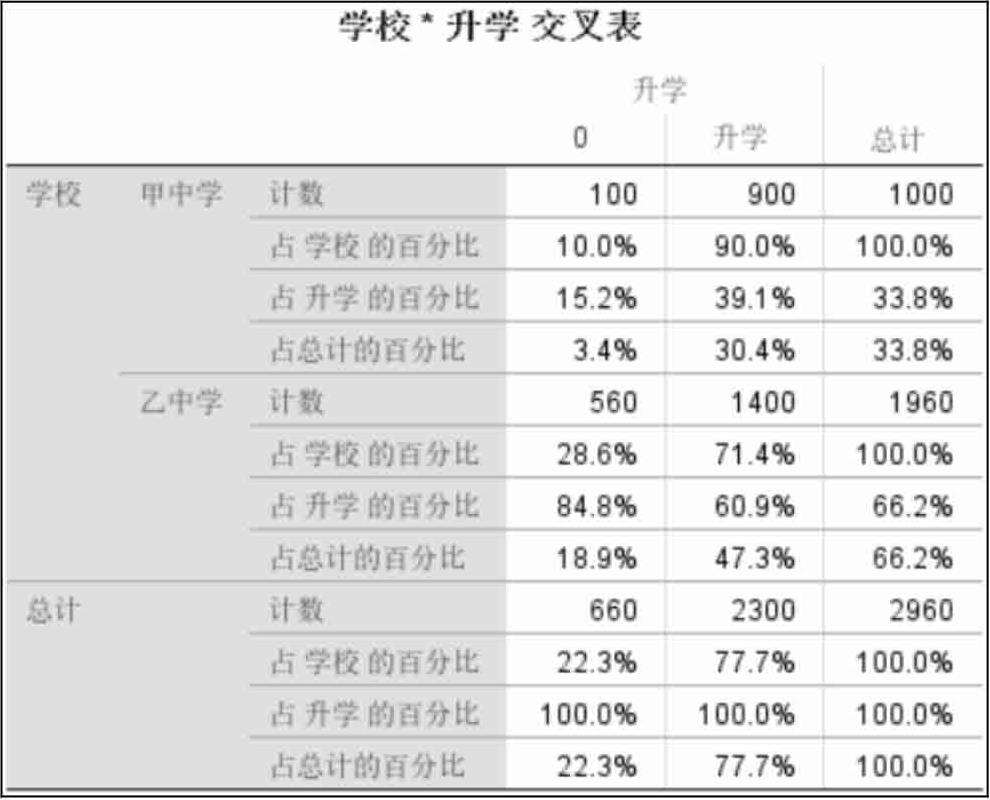 如表2.15所示,甲中学的升学率是90%,未升学率是10%;乙中学的升学率是71.4%,未升学率是28.6%。甲中学的升学人数占全部升学人数的39.1%,乙中学的升学人数占全部升学人数的60.9%;甲中学的未升学人数占全部未升学人数的15.2%,乙中学的未升学人数占全部未升学人数的84.8%。