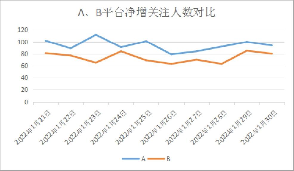 如图1-11所示为同一时间内两个平台的净增关注人数对比,该图便属于横向对比的一种形式。从该图中不难看出,A平台在2022年1月21日至30日的净增关注人数普遍要比B平台高一些。