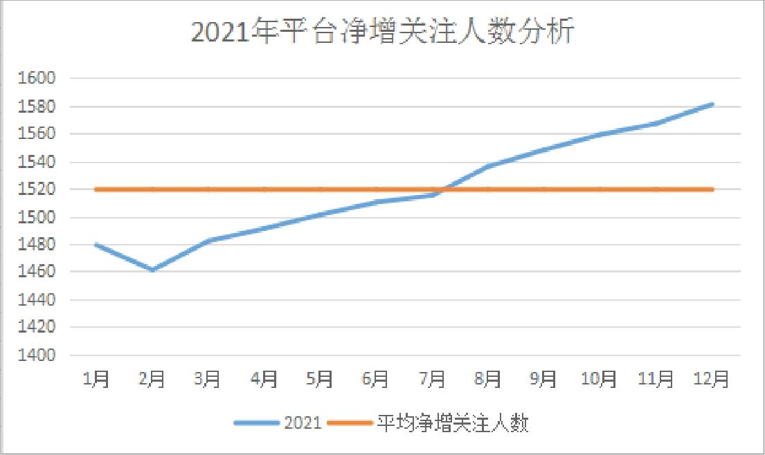 如图1-14所示为某平台2021年净增关注人数分析。该图便是通过与平均(即算数平均值)净增关注人数的对比,来分析该平台2021年净增关注人数的数值表现的。很显然,这便是利用平均分析法进行数据分析。