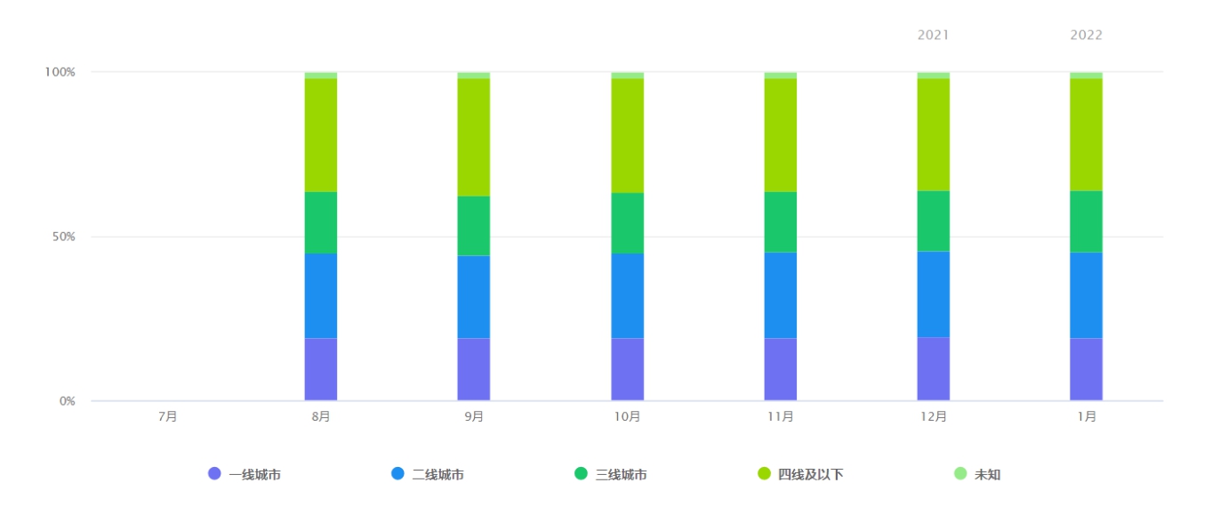 如图1-10所示为某账号粉丝的地域分布图。图中根据账号粉丝所属的城市级别先进行分组,然后对各城市线粉丝的占比情况进行呈现,这便属于分组分析。
