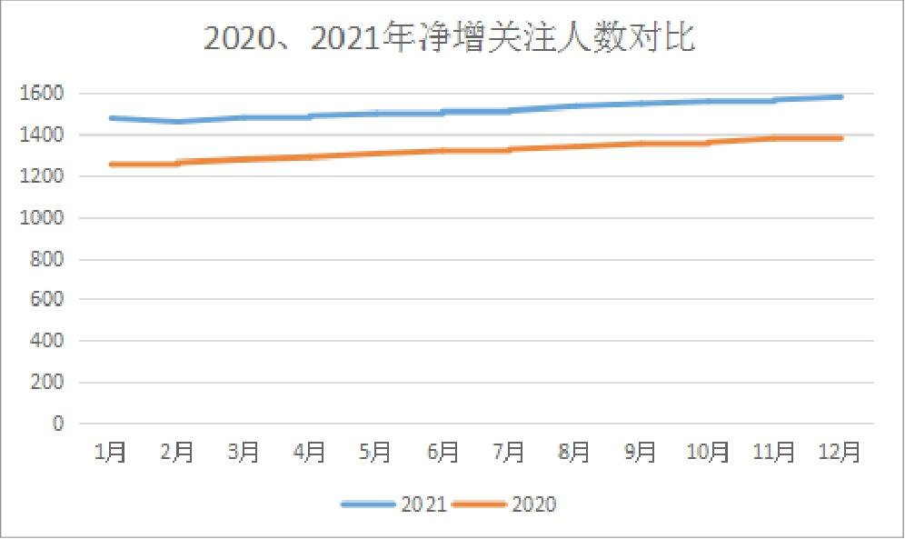 如图1-12所示为某店铺2020年、2021年净增关注人数对比,该图便是通过纵向对比来进行分析的。从该图中不难看出,该店铺2021年的净增关注人数明显要高于2020年。