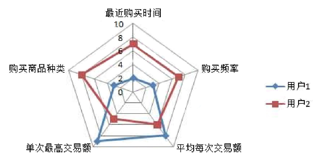 通常来说,如果一个数据相对较低,那么该数据便是有待提高的。因此,雷达分析法常被用来寻找运营过程中的薄弱环节。如图1-19所示为某账号的用户购买行为分析图,其使用的便是雷达分析法。