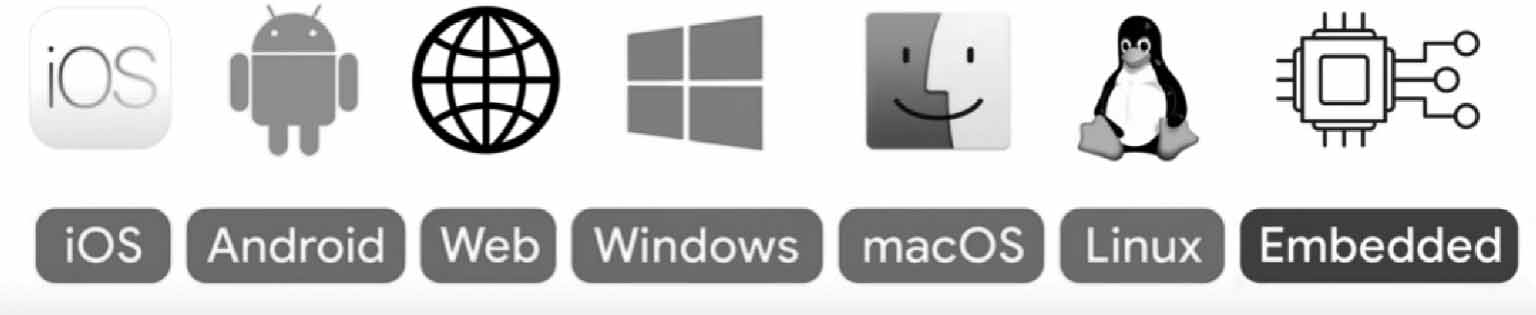 2018年,谷歌发布了一款新的跨平台移动UI框架:Flutter。该框架是构建谷歌下一代物联网操作系统Fuchsia OS的SDK,主打跨平台、高保真、高性能。开发者可以通过Dart语言开发App,可以实现一套代码同时运行在iOS、Android、浏览器、Windows、Mac等7个平台,如图1-4所示。Flutter使用Native引擎渲染视图,并提供了丰富的组件和接口,这无疑为开发者和用户提供了良好的体验。