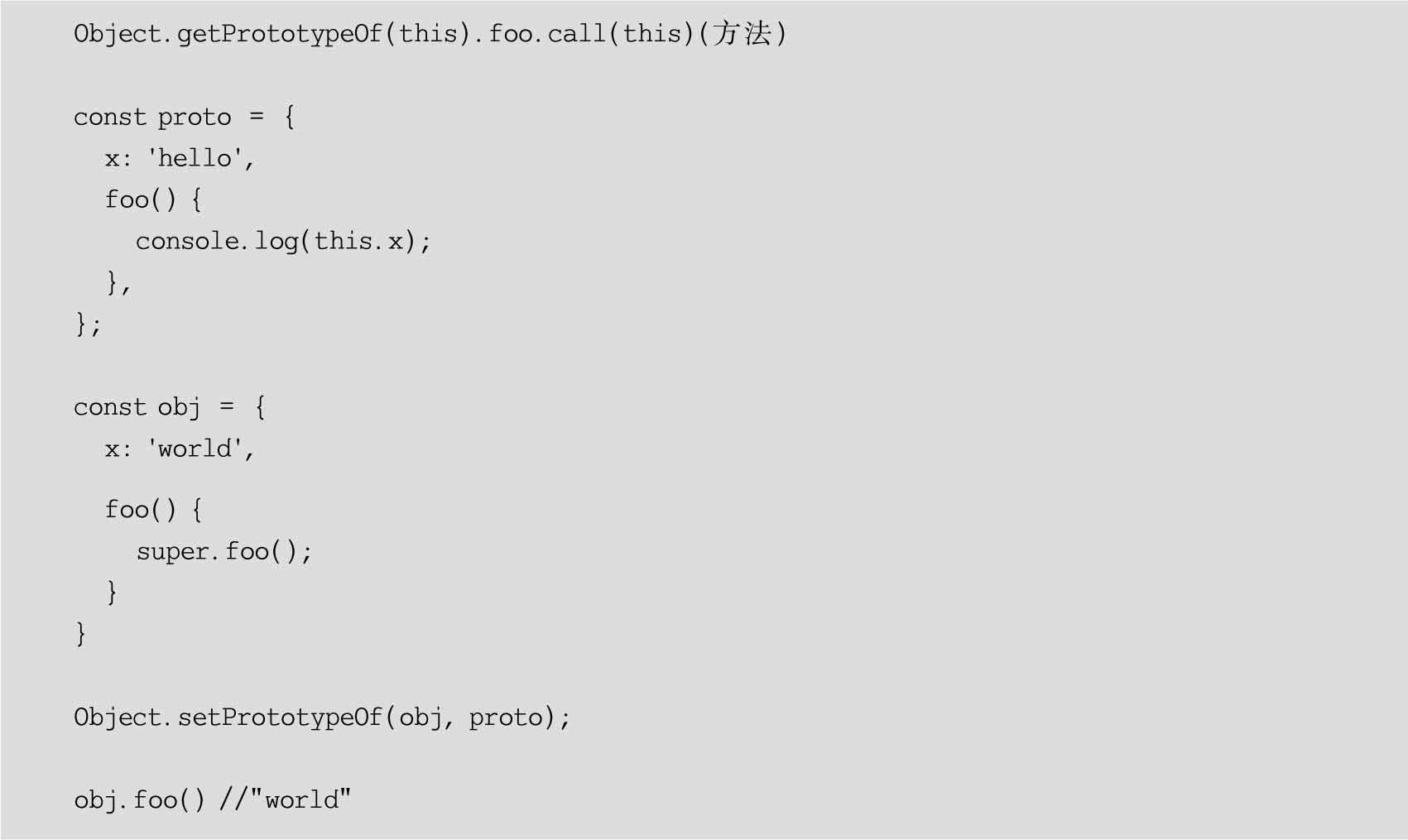 在上面的代码中,super.foo指向了原型对象proto的foo方法,但是绑定的this还是当前对象obj,因此输出的是world。