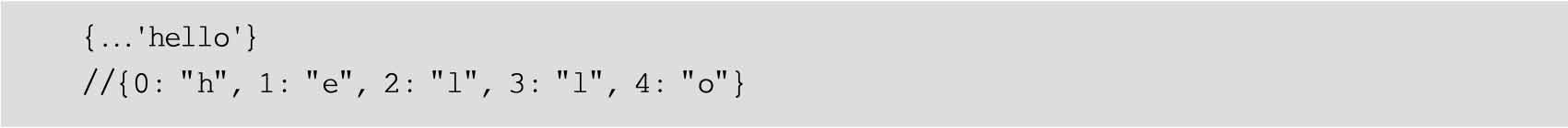 但是,如果扩展运算符后面是字符串,则它会自动转换成一个类似数组的对象,因此返回的不是空对象,如代码示例2-91所示。