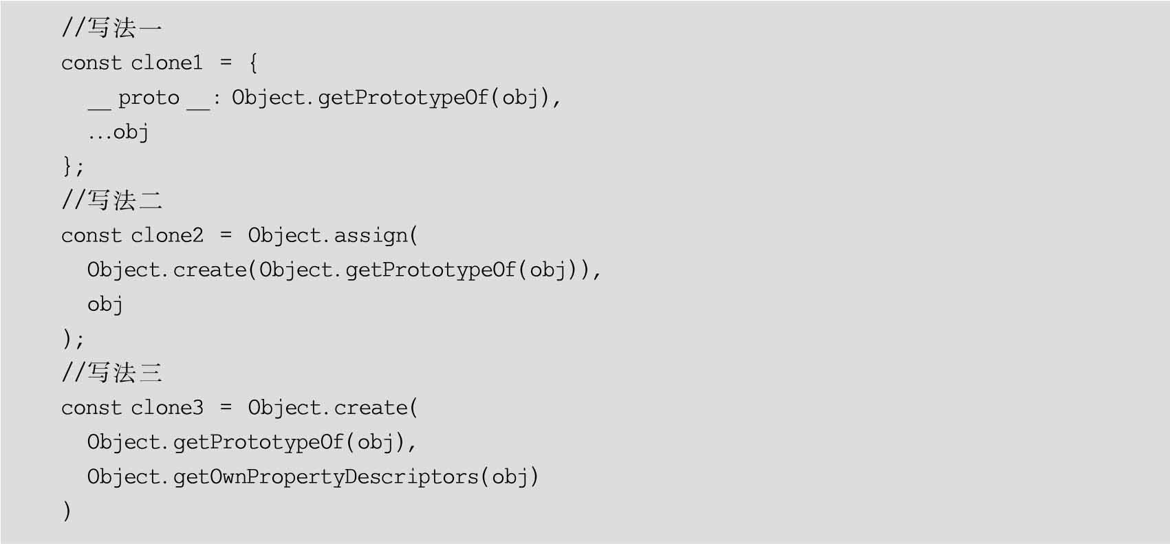 上面的例子只是复制了对象实例的属性,如果想完整克隆一个对象,并且复制对象原型的属性,则可以采用下面的写法,如代码示例2-93所示。