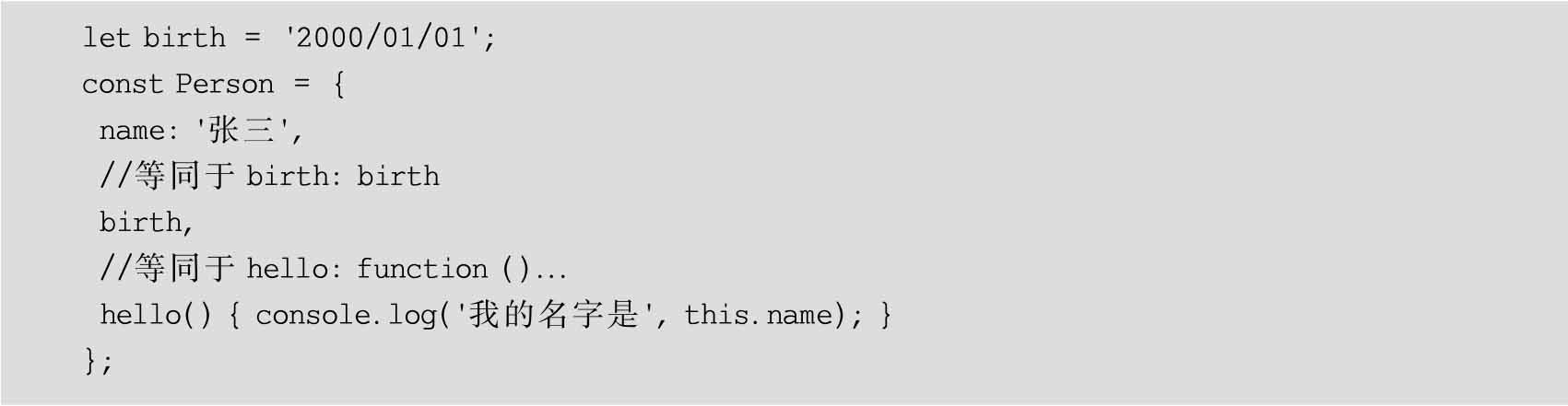 ES6允许在大括号里面直接写入变量和函数,作为对象的属性和方法。这样的书写方式可使代码更加简洁,如代码示例2-64所示。