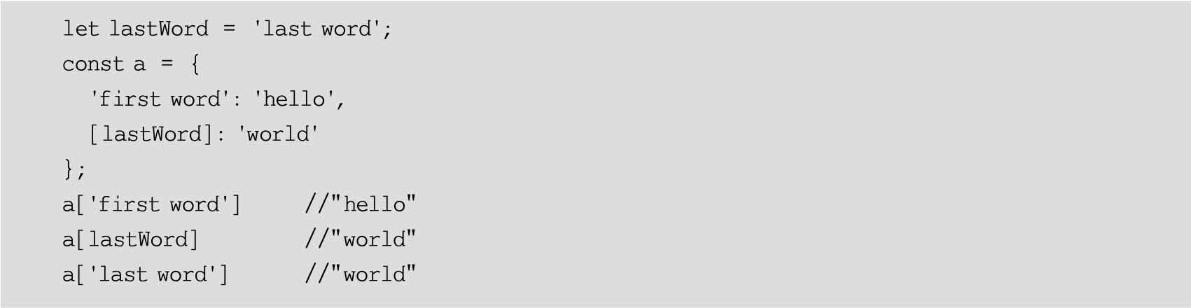 上面代码的方法一直接用标识符作为属性名,方法二则用表达式作为属性名,这时要将表达式放在方括号之内。