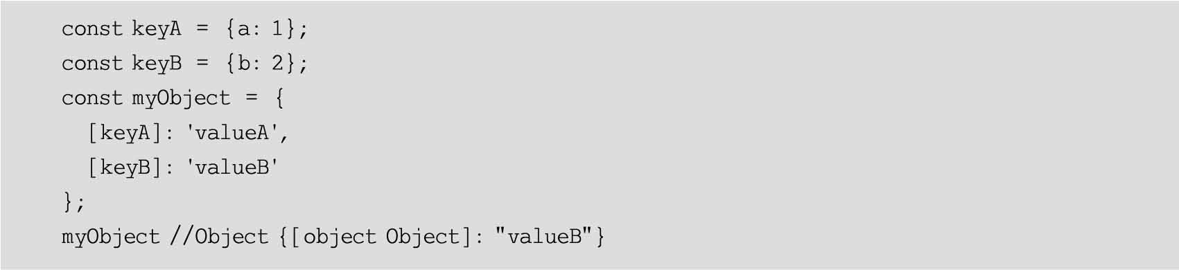 在上面的代码中,[keyA]和[keyB]得到的都是[object Object],所以[keyB]会把[keyA]覆盖掉,而myObject最后只有一个[object Object]属性。