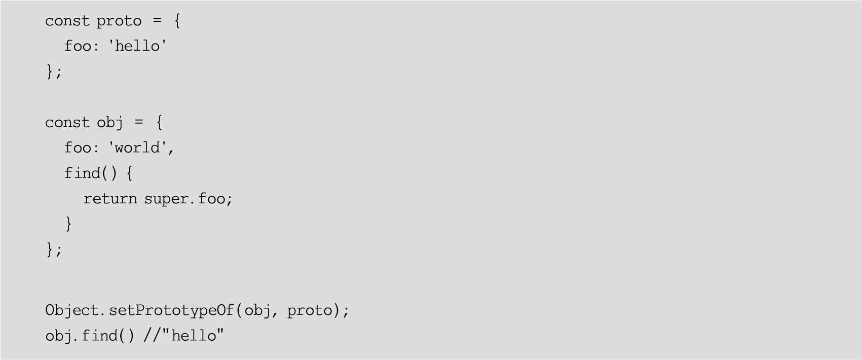 JavaScript引擎内部,super.foo等同于Object.getPrototypeOf(this).foo(属性),如代码示例2-78所示。