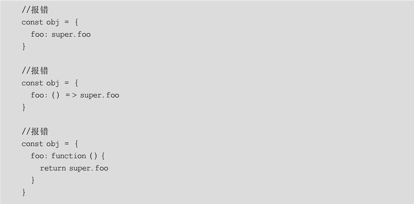 上面3种super的用法都会报错,因为对于JavaScript引擎来讲,这里的super都没有用在对象的方法之中。第1种写法将super用在属性里面,第2种和第3种写法将super用在一个函数里面,然后赋值给foo属性。目前,只有对象方法的简写法可以让JavaScript引擎确认所定义的是对象的方法。
