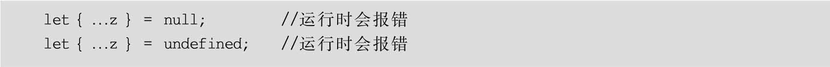 由于解构赋值要求等号右边是一个对象,所以如果等号右边是undefined或null,就会报错,因为它们无法转换为对象,如代码示例2-80所示。