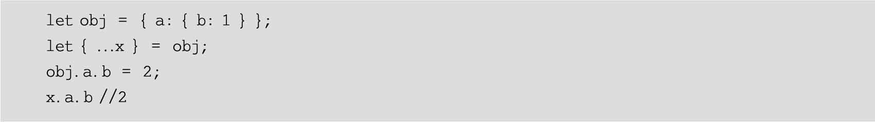 注意,解构赋值的复制是浅复制,即如果一个键的值是复合类型的值(数组、对象、函数),则解构赋值复制的是这个值的引用,而不是这个值的副本,如代码示例2-82所示。