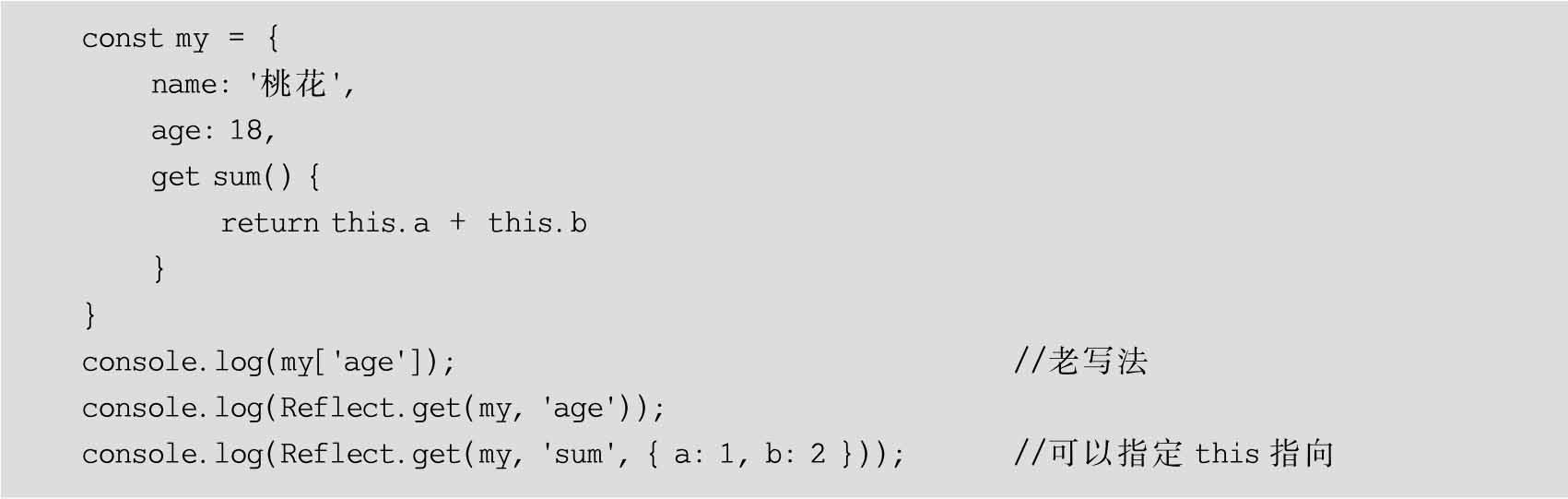 Reflect.get()方法用于获取对象中对应key的值,如代码示例2-128所示。